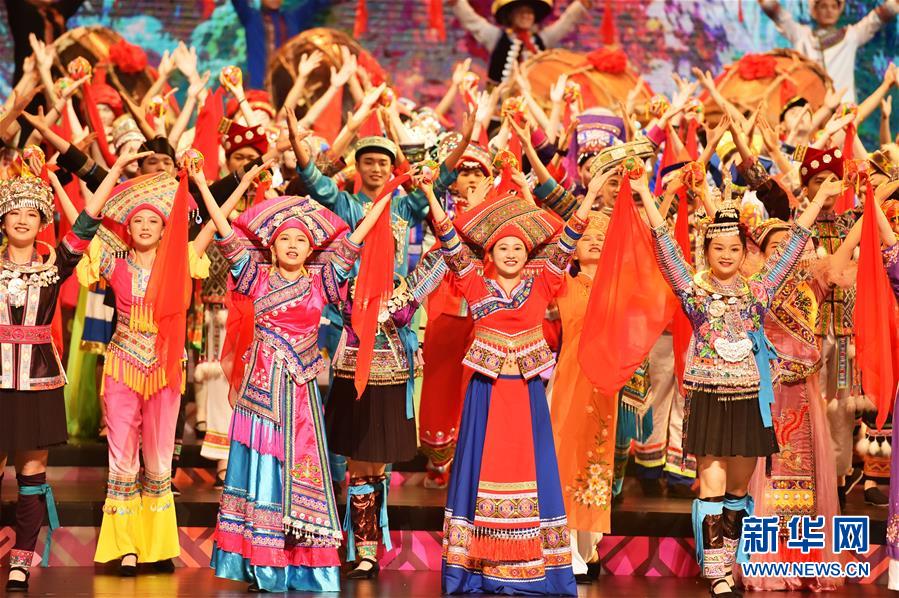 演员在广西南宁举行的晚会现场表演具有民族特色的舞蹈《山歌迎客》(4月26日摄)。 当日,第29届中国戏剧梅花奖、第23届曹禺剧本奖颁奖晚会在广西南宁举行。 新华社记者 曹祎铭 摄