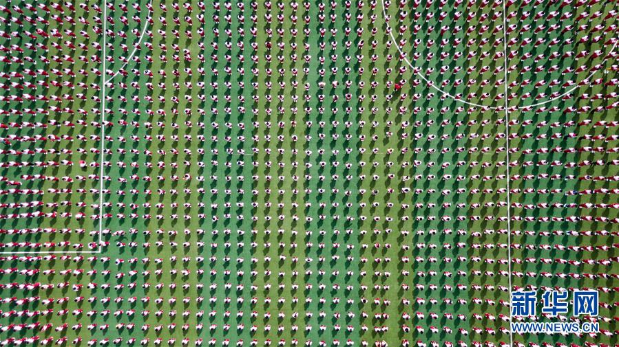 4月26日,江苏省宿迁市沭阳南洋学校学生在操场进行葫芦丝吹奏集体表演活动(无人机拍摄)。 新华社记者 李响 摄