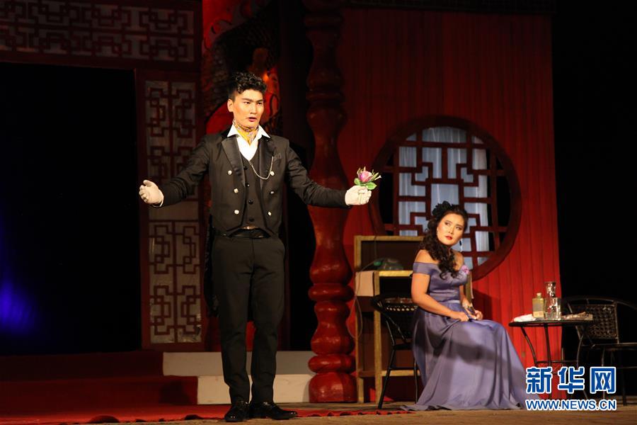 4月27日,在蒙古国首都乌兰巴托国家话剧院,演员表演话剧《日出》。 当日,蒙古国话剧艺术家精心编排的中国近代经典话剧《日出》在乌兰巴托蒙古国国家话剧院成功首演。 新华社发(苏力雅摄)