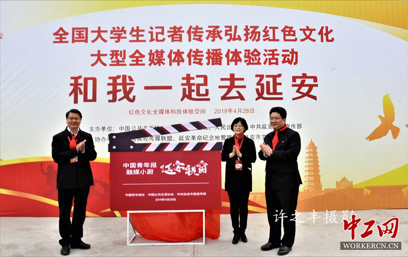2019年4月28日在延安举行“红色文化全媒体科技体验空间”的启动仪式。由中国公共关系协会、中国青年报社、人民出版社、中共延安市委宣传部合作共建“红色文化全媒体传播工程”。运用先进数字影像技术、顶尖主流媒体传播平台、国际国内优秀传播团队,多角度、多层次、立体化打造以延安为代表的红色文化中国名片,讲好中国故事,传播中国好声音。全国大学生传承弘扬红色文化大型全媒体传播体验活动——“和我一起去延安”也同时启动。来自全国20所高校的20名优秀大学生记者到延安实地采访学习,用青年的视角,记录新时代延安的发展和变化。图为启航仪式现场。工人日报-中工网许之丰摄影报道
