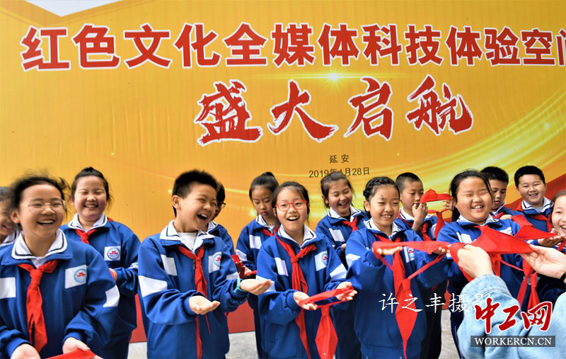 2019年4月28日在延安举行“红色文化全媒体科技体验空间”的启动仪式。由中国公共关系协会、中国青年报社、人民出版社、中共延安市委宣传部合作共建“红色文化全媒体传播工程”。运用先进数字影像技术、顶尖主流媒体传播平台、国际国内优秀传播团队,多角度、多层次、立体化打造以延安为代表的红色文化中国名片,讲好中国故事,传播中国好声音。全国大学生传承弘扬红色文化大型全媒体传播体验活动——“和我一起去延安”也同时启动。来自全国20所高校的20名优秀大学生记者到延安实地采访学习,用青年的视角,记录新时代延安的发展和变化。图为启航仪式现场。工人日报-中工网许之丰摄影报道