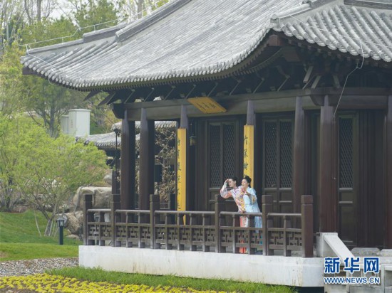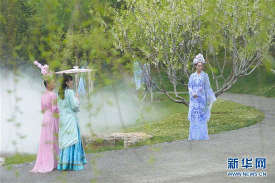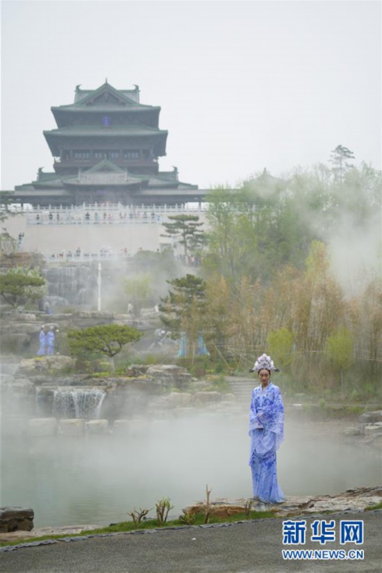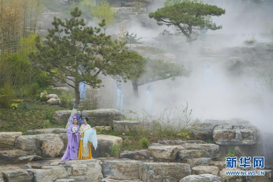 4月29日,演员在世园会园区的永宁阁下进行游园情景表演。 新华社记者 沈伯韩 摄