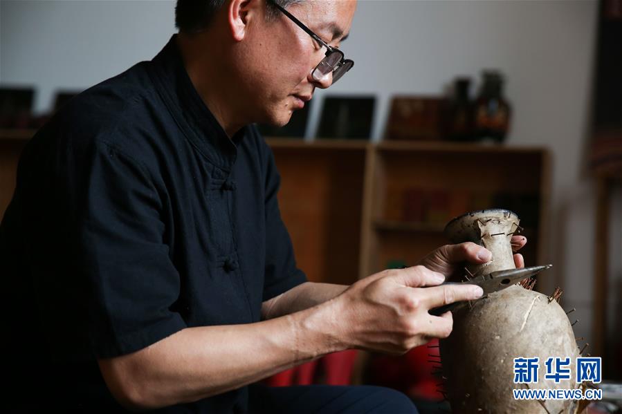 4月29日,在贵州省毕节市大方县高光漆器厂,高光友在木模上固定牛皮。 今年55岁的高光友家住贵州省毕节市大方县理化乡,从小目睹父亲用自己家漆树产出的土漆制作旱烟盒,原本就喜欢绘画的他对漆器产生了兴趣。1985年参加当地举办的漆器文化培训班后,高光友经老师介绍进入国营漆器厂拜师学艺,开始接受传统漆器文化的熏陶。 30多年来,高光友潜心研究漆器髹饰技艺。他介绍说,从生漆收割、胎坯制作到漆器形成,彝族漆器制作需要数十道工序,都由手工完成,虽然制作难度大、工期长,但这项彝族文化财富不能丢掉。2013年,高光友吸纳了一批民间漆器艺人,专门从事彝族漆器工艺品设计,还定期举办彝族漆器髹饰技艺传承人培训班,有效推动当地彝族漆器髹饰技艺的传承、保护和发展。 2008年,“彝族漆器髹饰技艺”被列入国家级非物质文化遗产名录。 新华社发(罗大富 摄)