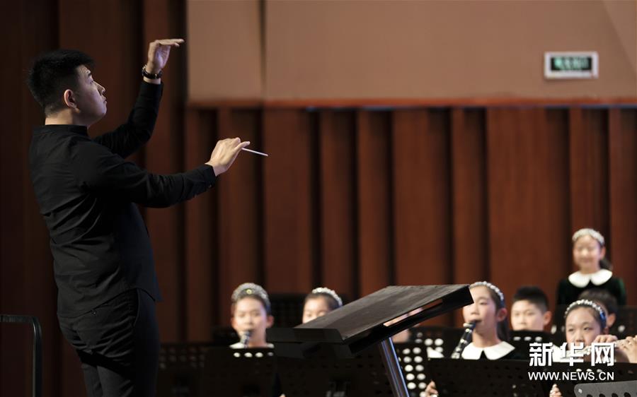 5月3日,北京第二实验小学金帆管乐团指挥王登梅在指挥乐团表演。新华社记者 丁汀 摄