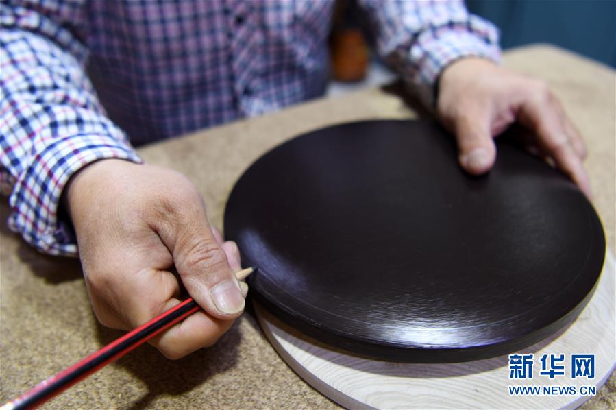 5月6日,申洪杰雕刻前在木板上绘图。木刻画所用的木板,经过多层上色而成,雕刻中按照色彩的需要调整刻刀的深浅度,从而让木刻画的色彩丰富。新华社记者范培珅摄