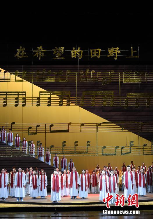 图为尾声阶段演员合唱施光南创作的歌曲《在希望的田野上》。