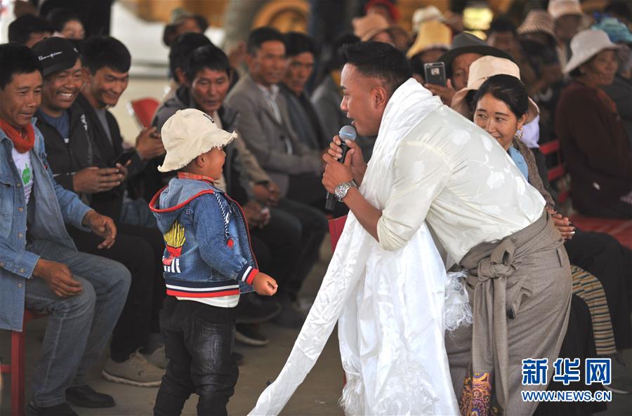 5月9日,在拉萨市堆龙德庆区加入村,小观众为拉萨市歌舞团演员献上哈达。