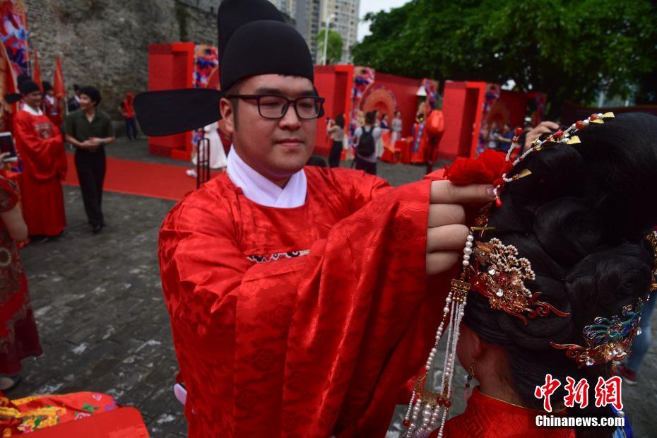 广西柳州六对新人在明代城门下举办“明制”婚礼 传统习俗“吸睛”