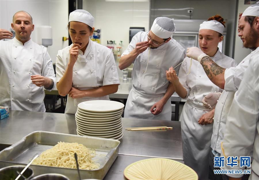 5月13日,在新西兰首都惠灵顿理工学院,西厨班学员试吃煮到八分熟的面条。 当日,作为新西兰2019“中国旅游文化周”文化交流活动的一部分,来自中国重庆的大厨给惠灵顿理工学院的西厨学员上了一场别开生面的中国美食普及教学课。 新华社记者 郭磊 摄