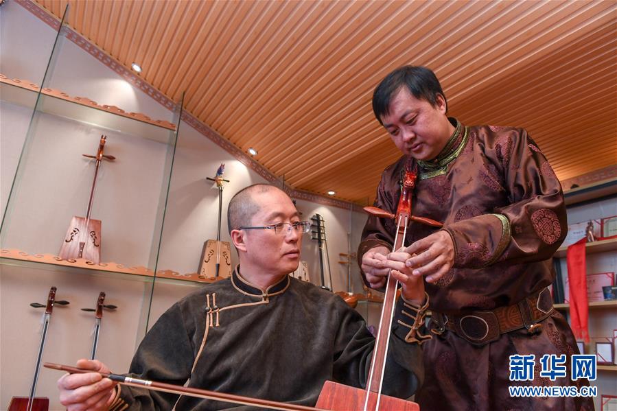 5月15日,白苏古郎(右)向学员传授马头琴的演奏技法。 新华社记者 张楠 摄