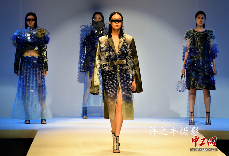 5月15日,在北京举行的2019中国国际大学生时装周,西南大学时装秀以“共同体”为主题的服装系列作品发布,运用传统扎染、版画、水墨画等东方文化的手作艺术与现代时尚相结合的设计理念,唤醒当代年轻人对传统文化的热情。工人日报-中工网许之丰摄影报道