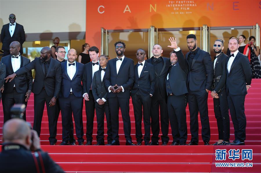 5月15日,在法国戛纳,戛纳电影节主竞赛单元影片《悲惨世界》导演拉吉·利(右七)携主创人员亮相首映红毯。 第72届戛纳电影节5月14日至25日在法国南部海滨城市戛纳举行。 新华社记者 张铖 摄