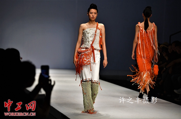 5月16日,2019年中国国际大学生时装周,上海工程技术大学中法埃菲时装设计师学院学生优秀设计作品发布以“变革”为主题,将西方服装设计理念、艺术风格、先进工艺技术与浓郁东方情调的民族传统特色服装有机结合的新时尚。工人日报-中工网许之丰摄影报道