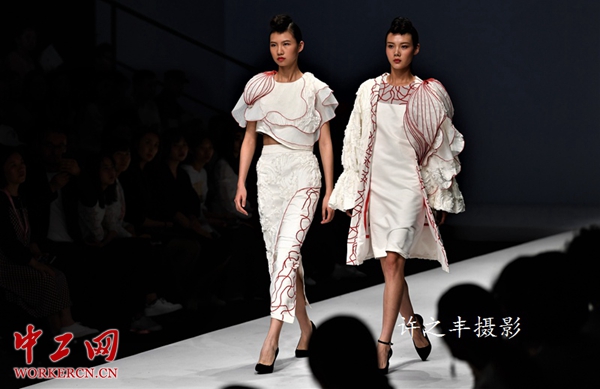 5月16日,2019年中国国际大学生时装周,上海工程技术大学中法埃菲时装设计师学院学生优秀设计作品发布以“变革”为主题,将西方服装设计理念、艺术风格、先进工艺技术与浓郁东方情调的民族传统特色服装有机结合的新时尚。工人日报-中工网许之丰摄影报道