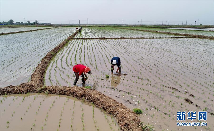 5月20日,唐山海港经济开发区王滩镇农民在田间补插秧苗(无人机拍摄)。 小满节气将至,河北省冀东地区唐山和秦皇岛水稻种植区农民抢抓农时,全面展开灌田、插秧,田间呈现出一派繁忙景象。 新华社记者 杨世尧 摄