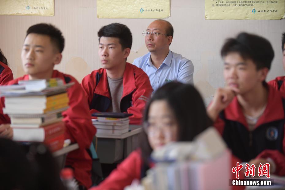 随着高考日益临近,王世卿利用工作生活中的零散时间复习备考,每晚会做模拟习题,有时也会与高考生一同上课学习。图为“高考哥”王世卿与高三学生一同上课备考。中新社记者 武俊杰 摄
