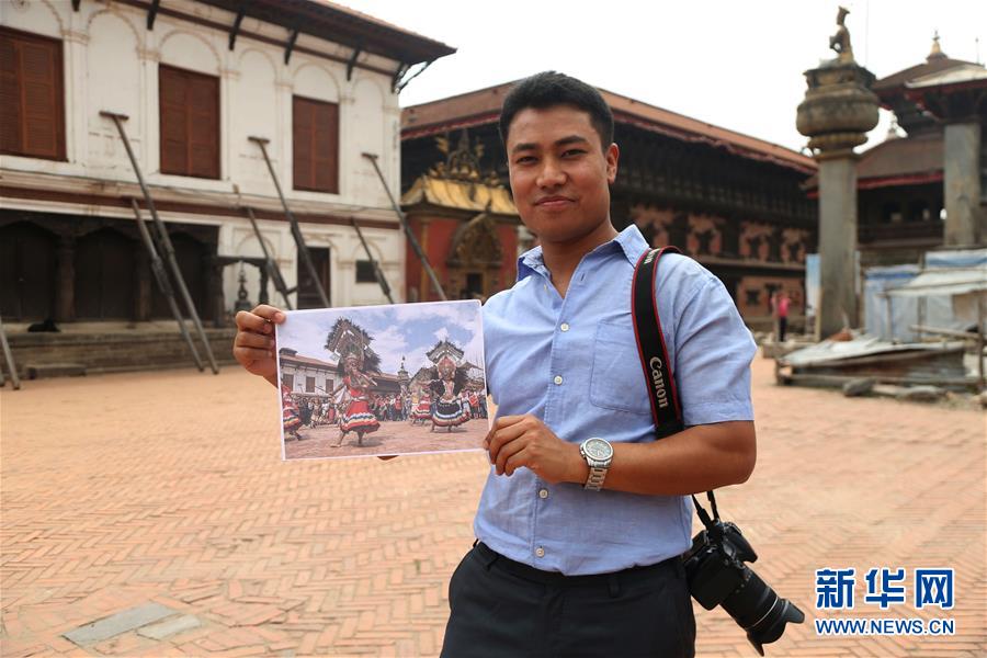 5月15日,在尼泊尔巴德岗杜巴广场,毕内亚展示他的入选照片——《拜拉布舞蹈》。 新华社发(苏尼尔·夏尔马摄)