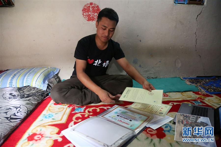 5月15日,在位于尼泊尔巴德岗的家里,毕内亚在展示自己获得的一些证书。新华社发(苏尼尔·夏尔马摄)