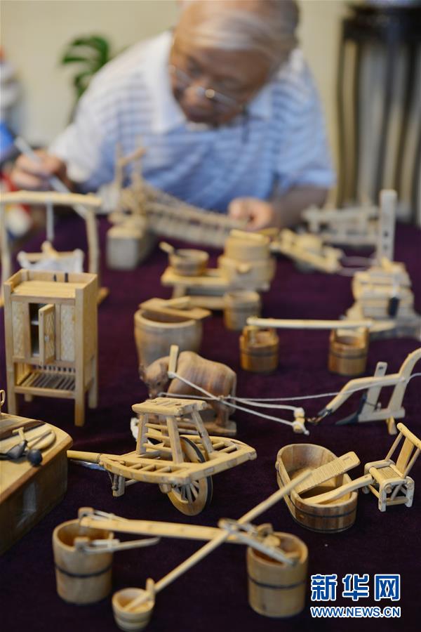 5月22日,陈和生在南京的工作室制作“老物件”。 今年70岁的陈和生是一个老南京人,他对小时候南京的市井生活印象非常深刻。退休后,他捡起自己一直以来的爱好木工活,开始用木料做农具、生活用品等“老物件”的微缩模型,想以此留下一些过往生活的记忆。没有师父,没有图纸,陈和生自学成才,10年来,他一共制作出了170余件微缩模型,还因此获得了“南京市工艺美术大师”的称号。 新华社发(方东旭 摄)