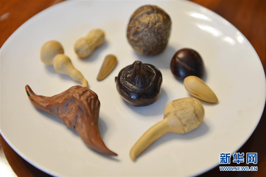 一个碟子里摆放着陈和生制作的“荸荠”“菱角”“核桃”等(5月22日摄)。 今年70岁的陈和生是一个老南京人,他对小时候南京的市井生活印象非常深刻。退休后,他捡起自己一直以来的爱好木工活,开始用木料做农具、生活用品等“老物件”的微缩模型,想以此留下一些过往生活的记忆。没有师父,没有图纸,陈和生自学成才,10年来,他一共制作出了170余件微缩模型,还因此获得了“南京市工艺美术大师”的称号。 新华社发(方东旭 摄)