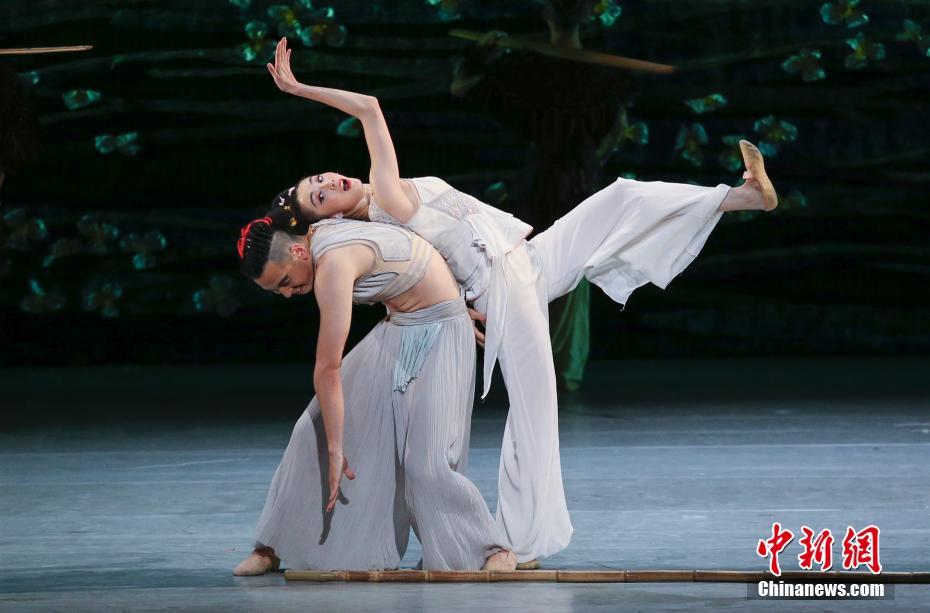 5月22日晚,舞剧《刘三姐》在北京天桥艺术中心上演,并由此开启2019年全国巡演。该剧根据壮族人物故事“刘三姐”改编,引入了流行音乐和街舞等潮流艺术,在人物形象、舞蹈风格、音乐创作等方面透露出鲜明的时代特色。图为剧中的刘三姐和阿牛哥。中新社记者 贾天勇 摄