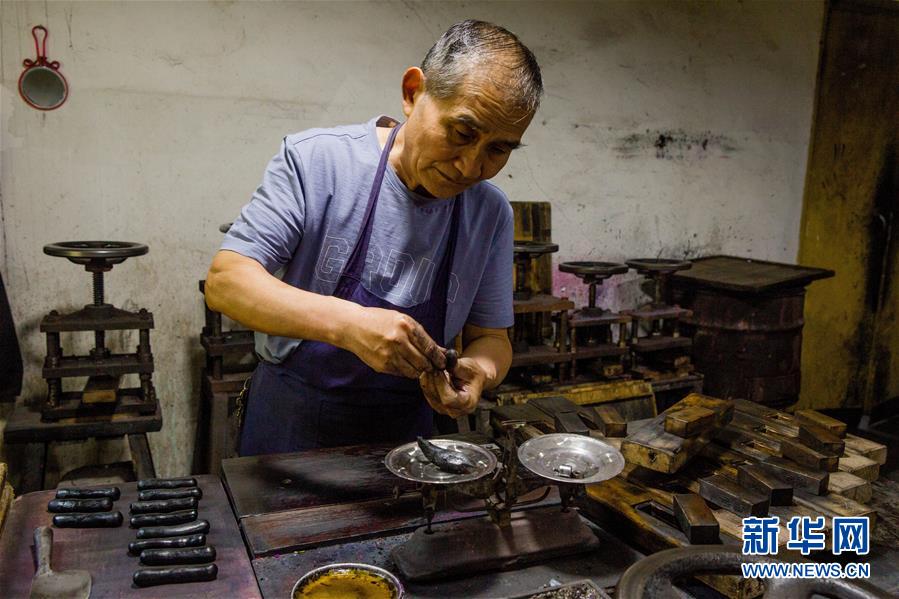 5月22日,在安徽省黄山市屯溪胡开文墨厂,工人给墨胚称重。 徽墨因产于古徽州府而得名,徽墨制作技艺被列入第一批国家级非物质文化遗产名录。胡开文墨是徽墨的杰出代表,200多年来,胡开文墨一直遵循点烟、和料、杵捣、制墨、晾墨等11道古法制墨工序,恪守传统配料和工艺,生产出来的胡开文墨“丰肌腻理、光泽如漆”。 新华社发(吴孙民 摄)