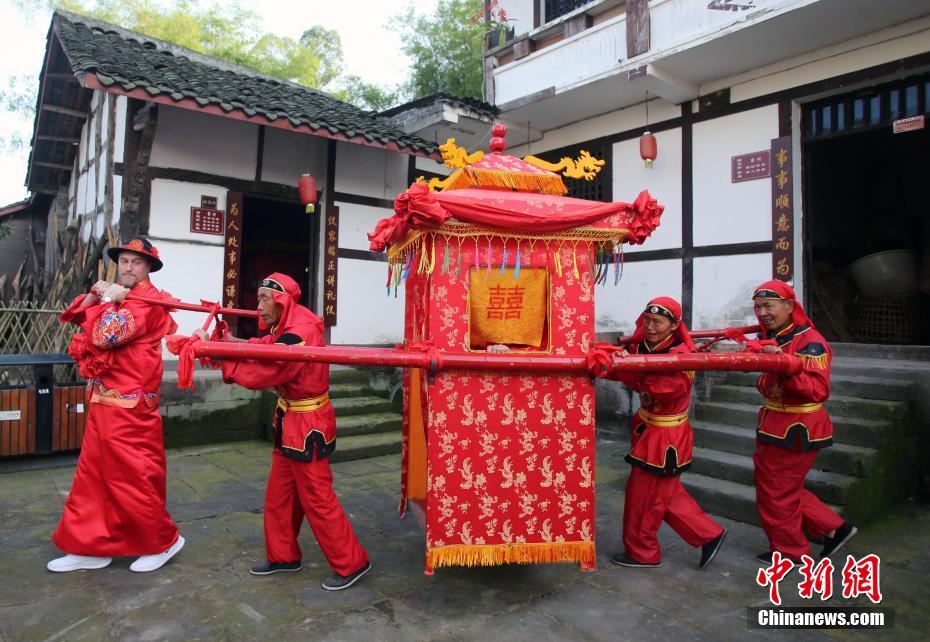 一位俄罗斯媒体代表着“新郎”装抬花轿。中新社记者 王磊 摄