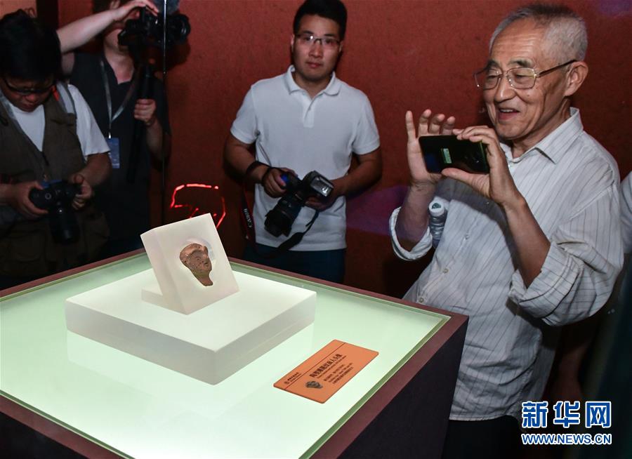 辽宁省文物考古研究所名誉所长、研究员郭大顺(右一)在蚌埠市博物馆参观双墩遗址出土的陶塑雕题纹面人头像(5月25日摄)。 新华社记者 李贺 摄