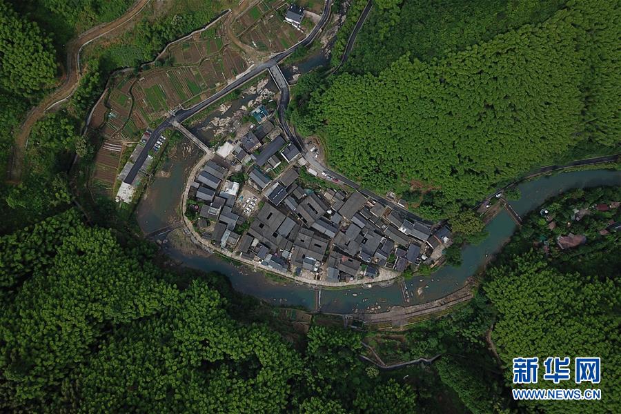 5月26日无人机拍摄的富春江镇石舍村。村庄依山傍水,风景秀美。 石舍村是浙江省桐庐县富春江乡村慢生活体验区中的三个村落之一,位置偏僻,依溪而居,风景秀美。近年来,石舍村结合古建筑保护工作,在清洁、美化村庄的基础上,对一些废弃古建筑进行修缮,引入咖啡馆、民宿等文化创意类项目,优良的生态环境和浓郁的文化氛围吸引大批游客前来体验,小山村走上了一条发展美丽经济之路。2018年,石舍村接待游客10万8千余人次,旅游经营净收入1260余万元。 新华社记者 黄宗治 摄