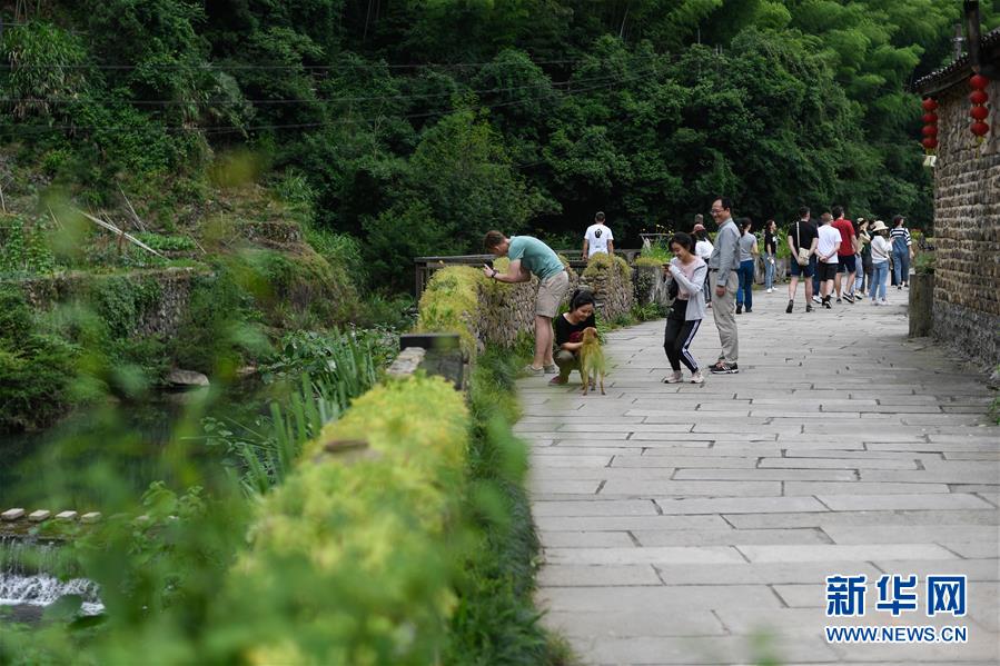 游客在石舍村游览(5月25日摄)。 石舍村是浙江省桐庐县富春江乡村慢生活体验区中的三个村落之一,位置偏僻,依溪而居,风景秀美。近年来,石舍村结合古建筑保护工作,在清洁、美化村庄的基础上,对一些废弃古建筑进行修缮,引入咖啡馆、民宿等文化创意类项目,优良的生态环境和浓郁的文化氛围吸引大批游客前来体验,小山村走上了一条发展美丽经济之路。2018年,石舍村接待游客10万8千余人次,旅游经营净收入1260余万元。 新华社记者 黄宗治 摄