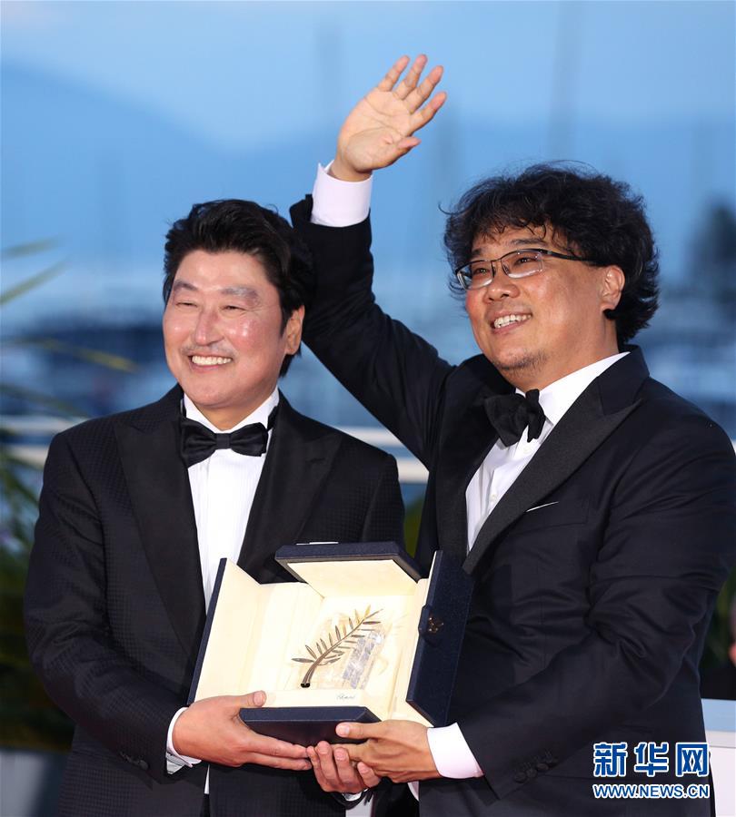 5月25日,在法国戛纳,韩国导演奉俊昊(右)与演员宋康昊手捧金棕榈奖杯出席拍照式。 第72届戛纳电影节25日闭幕,第二次入围主竞赛单元的韩国导演奉俊昊凭借影片《寄生虫》将最高奖最佳影片金棕榈奖揽入囊中。 新华社记者 高静 摄