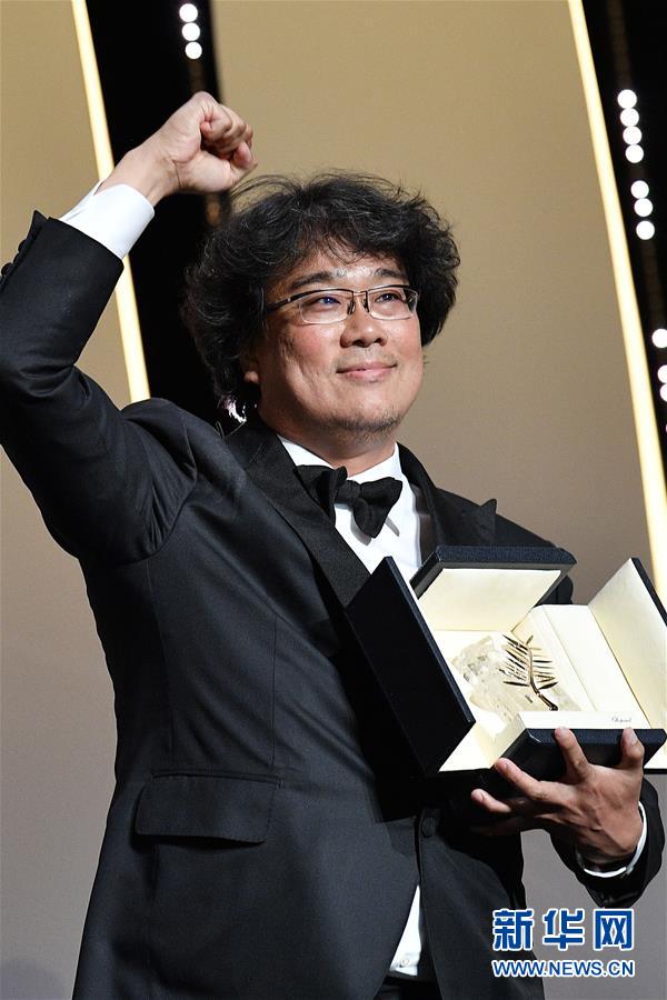 5月25日,在法国戛纳,韩国导演奉俊昊手捧金棕榈奖杯出席闭幕式。 第72届戛纳电影节25日闭幕,第二次入围主竞赛单元的韩国导演奉俊昊凭借影片《寄生虫》将最高奖最佳影片金棕榈奖揽入囊中。 新华社发(凯姆·伊达摄)