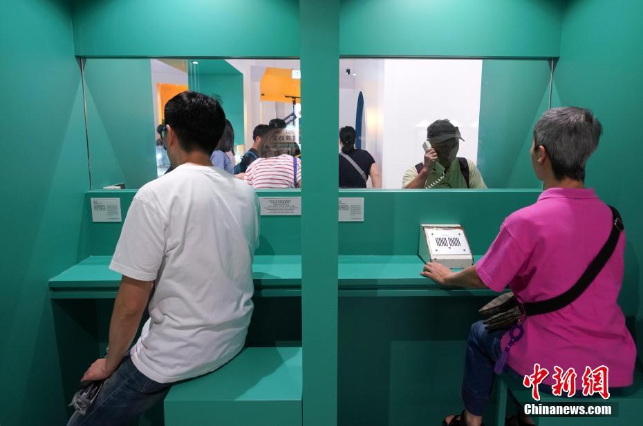 5月26日,香港“大馆”开幕一周年之际,“大馆101”专题展览正式向公众开放。该展览透过展示101件与香港中区警署建筑群(大馆)相关的物品,娓娓道来昔日发生在“大馆”里的各种故事。参观者可以任选角色手册,分别扮演警员、大平绅士、囚犯、狱吏和市民,通过遍布大馆的互动装置,发现不同身份的人物与展品之间的关系,从而发掘“大馆”的精彩故事。图为参观者扮演囚犯和亲友在探访间探视。中新社记者 张炜 摄