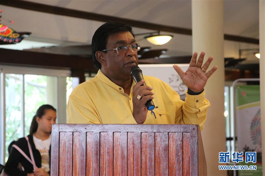 5月26日,在毛里求斯弗利康弗拉克,毛文化部长鲁蓬在活动开幕式上讲话。 2019毛里求斯中国旅游文化周暨第14届龙舟节庆典系列活动之“彩鸢翩跹——潍坊风筝展及文化互动体验活动”26日在毛里求斯西部城市弗利康弗拉克举行。活动通过潍坊风筝扎制培训、风筝展览、文创产品展示、风筝主题创意服装秀、潍坊旅游宣传片放映等组成全方位、立体式文化体验活动,展示中国人文自然风景和中华优秀传统文化,推动中毛文化友好交流。 新华社发(毛里求斯中国文化中心供图)