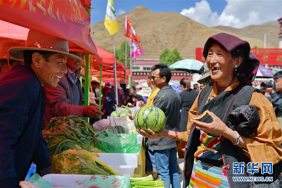 5月28日,当地农牧民在白朗县丰登广场品尝西瓜。 近日,西藏日喀则市白朗县1.46万亩瓜果蔬菜喜获丰收。百姓们在县里的丰登广场载歌载舞,庆祝白朗县第九届果蔬采摘节。 新华社记者 张汝锋 摄