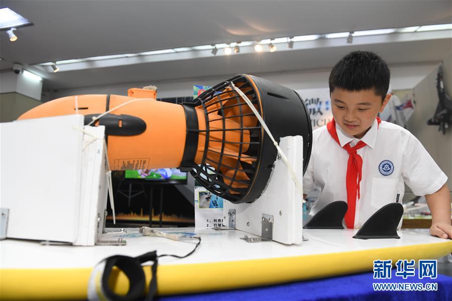 5月30日,合肥市六安路小学学生在2019年“科艺节”上观看科技小发明。 当日,安徽省合肥市六安路小学2019年“科艺节”在合肥久留米友好美术馆开幕,集中展示该校师生的绘画、书法、手工制作、科技小发明等作品。近年来,六安路小学以科学和艺术课程为载体,培养孩子们的兴趣,点亮他们的梦想。 新华社记者 张端 摄
