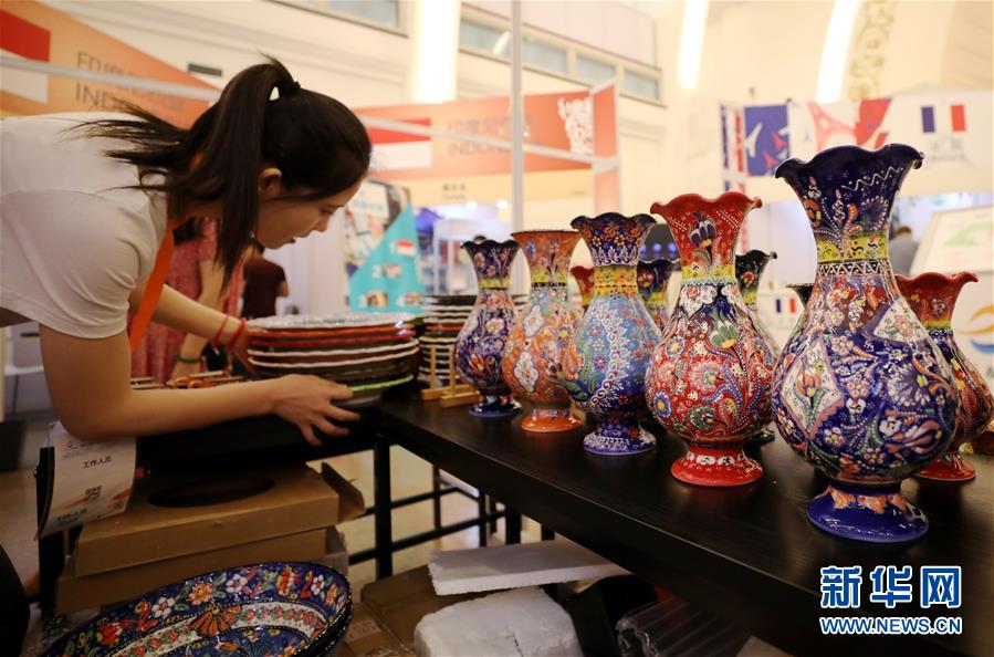 5月31日,一位工作人员在展位上整理土耳其手绘陶瓷展品。 当日,以 “品质生活 携手共创”为主题的“2019一带一路名品展·上海”在上海展览中心开幕。 新华社记者 方喆 摄