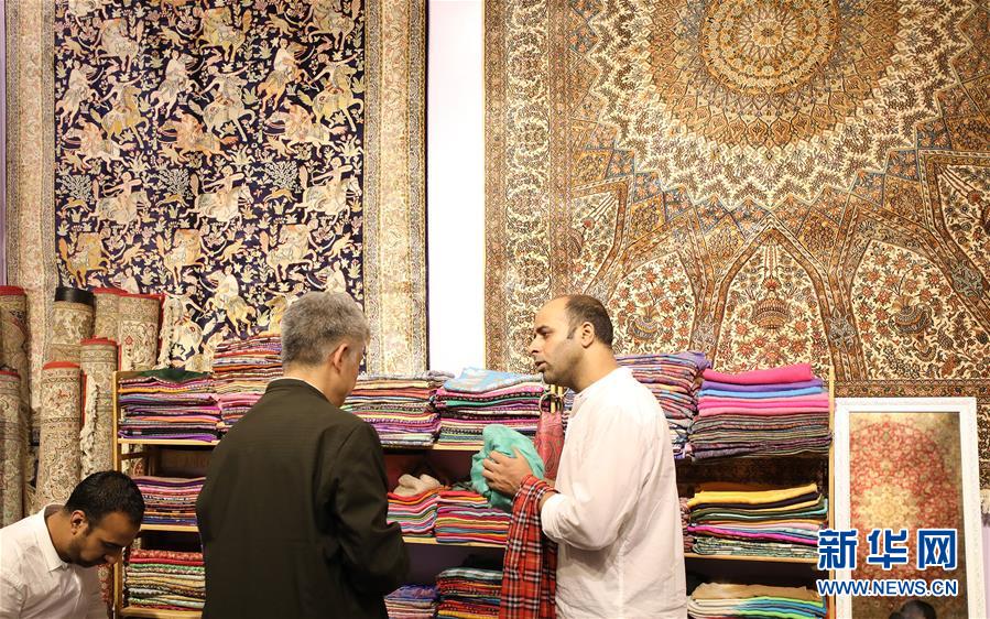 5月31日,一位展商(右)向参观者介绍丝巾展品。 当日,以 “品质生活 携手共创”为主题的“2019一带一路名品展·上海”在上海展览中心开幕。 新华社记者 方喆 摄