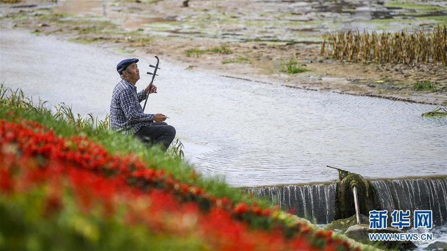 强有雷在金沟河旁拉胡琴(5月29日摄)。