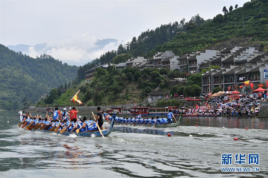 6月1日,人们在重庆市秀山土家族苗族自治县大溪乡进行龙舟赛。 端午节临近,多地举行龙舟赛喜迎端午。 新华社发(龙恩泽 摄)