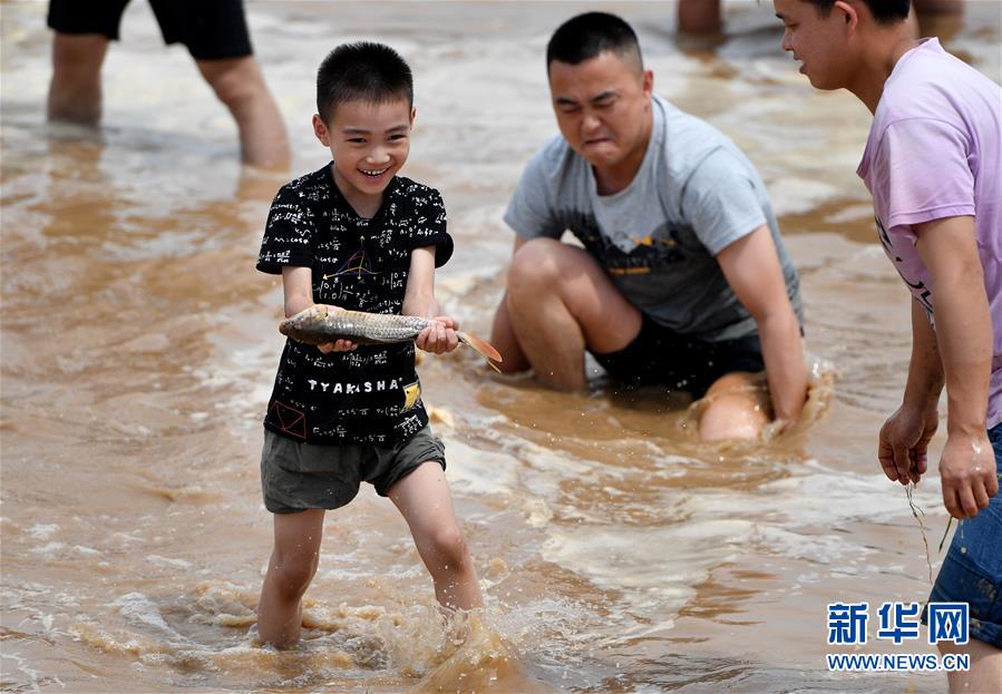 6月1日,在郑州举行的黄河鲤鱼文化节摸鱼活动中,一名小朋友成功捉到一条鲤鱼。 新华社记者李嘉南摄