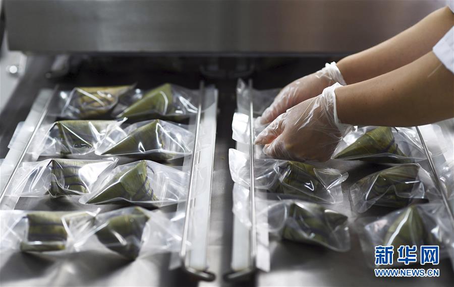 6月2日,在台江县一家食品生产企业车间,工人将煮熟的五彩粽进行真空包装。 新华社发(刘开福 摄)