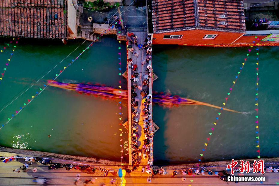 6月4日晚,华灯初上,福建长乐江田镇三溪村数十条龙舟在小溪中竞渡,两岸观众的吆喝声、欢呼声、加油声此起彼伏。几百年来,端午前后,村里一直延续着夜赛龙舟的风俗。据传,以前村民白天辛苦劳作,到了晚上才有闲暇,于是白天外出劳作赶不上龙舟赛的人,傍晚一收工就趁着暮色挑灯竞渡。如今,三溪村独有的夜赛龙舟端午习俗,已经已成远近闻名的传统盛会。张斌 摄