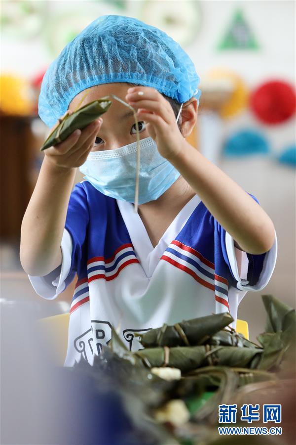 6月5日,一名小朋友在山东省高青县田镇学区中心幼儿园学习包粽子。 端午将至粽飘香,各地群众用包粽子的方式迎接传统节日。 新华社发(张维堂摄)