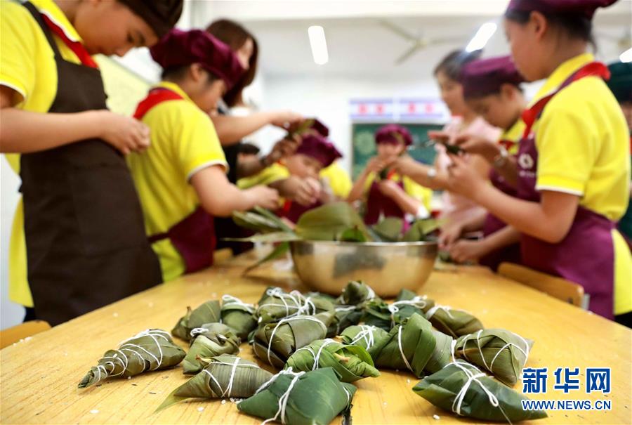 6月5日,河北省邢台市任县一所小学的学生与老师一起包粽子。 端午将至粽飘香,各地群众用包粽子的方式迎接传统节日。 新华社发(宋杰摄)