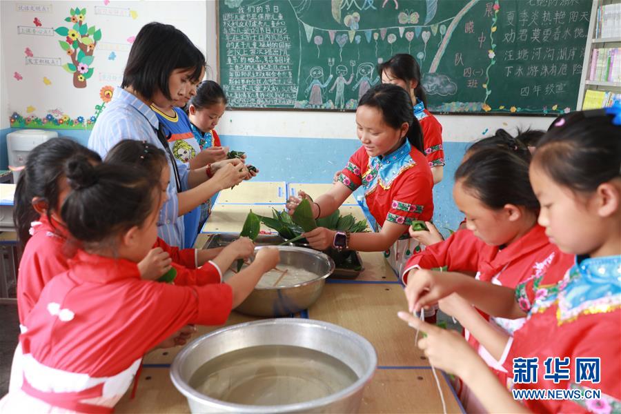 6月5日,贵州省黔西县石板桥小学老师指导学生包粽子。 端午将至粽飘香,各地群众用包粽子的方式迎接传统节日。 新华社发(周训超摄)