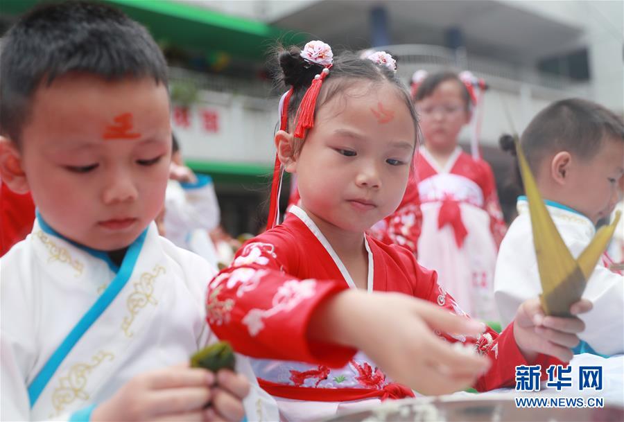 6月5日,四川省华蓥市实验幼儿园的小朋友体验包粽子。 端午将至粽飘香,各地群众用包粽子的方式迎接传统节日。 新华社发(邱海鹰摄)