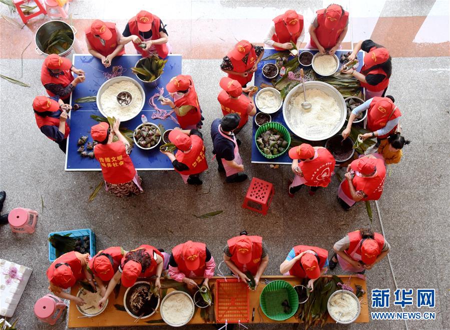 6月5日,在浙江省台州市仙居县爱心助老协会,志愿者包粽子,准备送给敬老院老人和环卫工人。 端午将至粽飘香,各地群众用包粽子的方式迎接传统节日。 新华社发(王华斌摄)