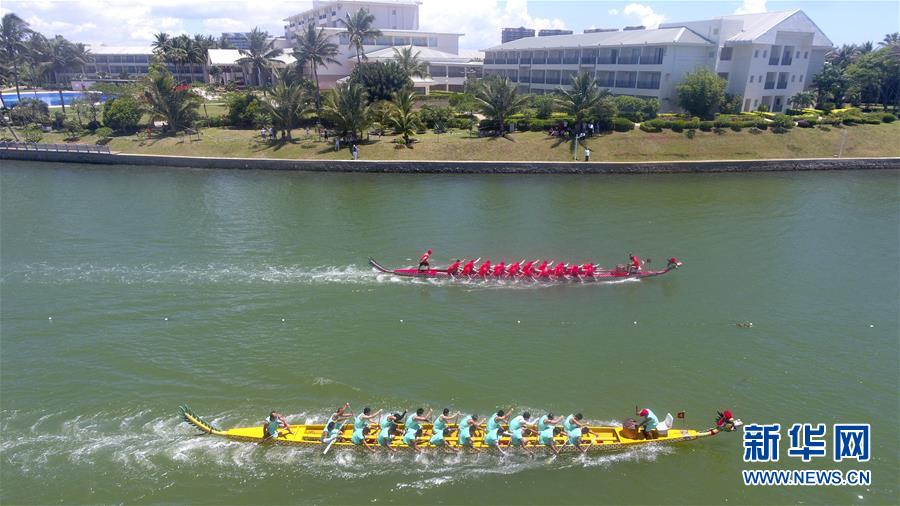 6月7日,人们在海南博鳌镇万泉河赛龙舟(无人机拍摄)。 新华社发(蒙钟德摄)