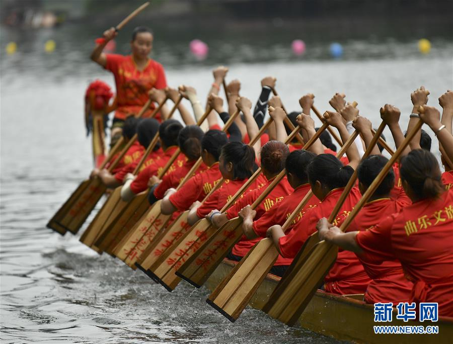 6月7日,在湖南花垣县边城镇清水江上,女子龙舟队员在比赛中竞逐。新华社发(龙恩泽摄)